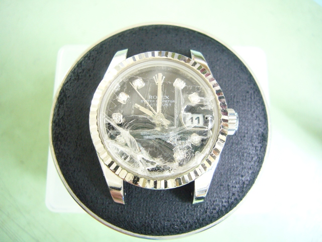 ガラス粉砕により文字盤に深いキズが付いております。